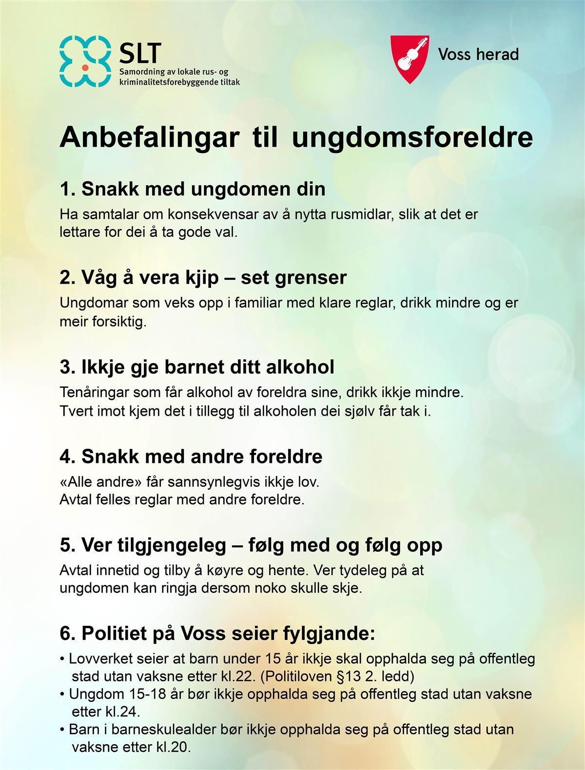 Oppvekst i Ulvik Herad oppmodar om at alle ungdomsforeldre føl dei same anbefalinga som Voss Herad anbefaler.