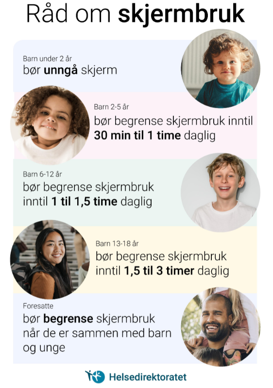 Skjermbruk blant barn, unge og føresetteHelsedirektoratet har gode råd om skjermbruk.Skjermbruk blant barn, unge og foresatte - Helsedirektoratet Publisert 09.01.2026 09.42 Sist endra 09.01.2026 09.42