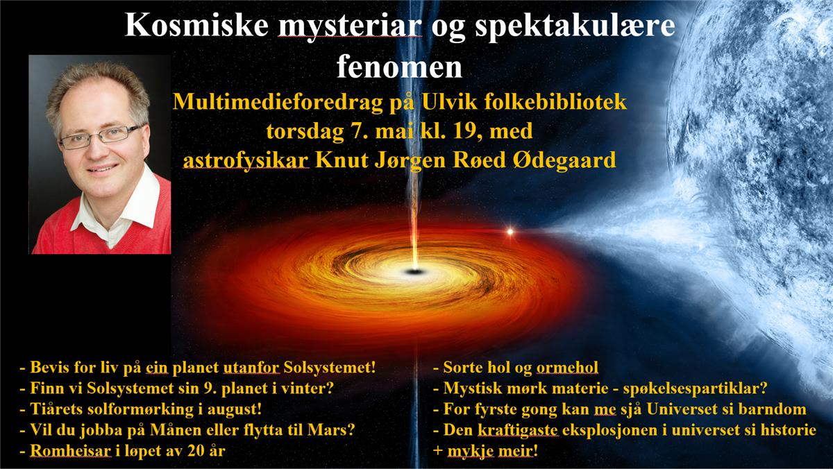Kosmiske mysteriar og spektakulære fenomenMultimedieforedrag på Ulvik folkebibliotek, torsdag 7. mai kl. 19, med astrofysikar Knut Jørgen Røed Ødegaard Publisert 28.04.2026 10.44 Sist endra 28.04.2026 10.47